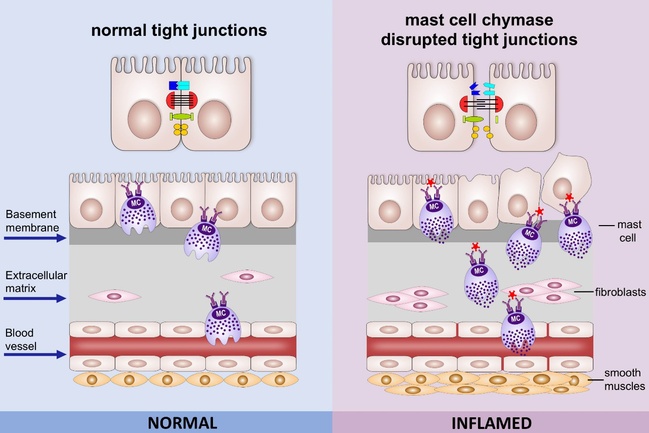 慢性哮喘的主要特征是上皮屏障功能失調和氣道壁損傷,氣道上皮細胞的脫落是哮喘氣道炎癥的后果之一,其病理機制不甚清楚。周曉鷹教授研究團隊用氣道組織原位模型、計算機圖像分析技術和免疫熒光技術,為闡明新的分子機制提供了證據。該研究發現:在炎癥條件下,激活的肥大細胞專屬性類糜蛋白酶通過降解氣道上皮細胞膜上的緊密接合部蛋白分子群(上皮型鈣黏附蛋白,閉合蛋白,閉鎖蛋白-4,緊密連接蛋白-1),損傷氣道上皮組織中細胞與細胞、細胞與基底膜之間結合的完整性并影響信息傳導;肥大細胞類糜蛋白酶下調細胞內的結構蛋白-細胞角蛋白和局部粘著斑激酶的表達以減弱細胞粘附能力,并激活細胞外的基質金屬蛋白酶-2的前體以誘導基底膜基質重塑而抑制創面愈合,導致哮喘氣道上皮脫落,進而引起上皮屏障功能失調和氣道壁損傷。