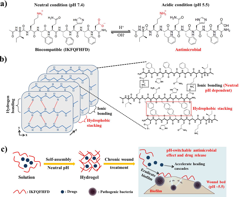 本工作在前期研究的基礎(chǔ)上,設(shè)計了一種具有酸性pH激活的廣譜抗菌八肽(IKFQFHFD)。此多肽在中性pH條件下具有良好的生物相容性,并能通過自組裝形成超分子水凝膠載藥體系。體外實驗表明,此水凝膠載藥體系在傷口感染微環(huán)境條件下(酸性pH)能夠發(fā)生解聚,從而同時實現(xiàn)了生物膜的殺傷和傷口愈合藥物的原位釋放。另外,動物實驗結(jié)果表明,此水凝膠體系能夠在20天內(nèi)成功實現(xiàn)糖尿病小鼠耐藥細菌生物膜感染傷口的完全愈合,顯示出了作為慢性傷口敷料的巨大應(yīng)用潛力。