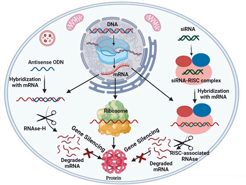 圖2. mRNA, siRNA, 反義寡核苷酸的細胞內通路示意圖。