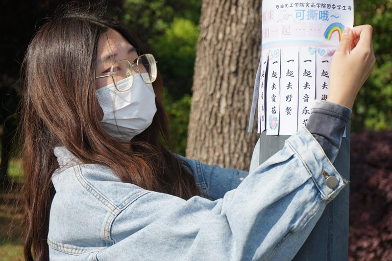 近日,石化學(xué)院在校園內(nèi)開展張貼“心愿便利貼”志愿活動(dòng)。同學(xué)們用富有創(chuàng)意的圖案文字手制了各具風(fēng)格的便利貼,每一筆都蘊(yùn)含著希望。燈柱上、樹干上、花壇旁……校園內(nèi)的各個(gè)角落都貼滿了“濃濃真情”。“一起吃火鍋”“一起看電影”“一起去露營(yíng)”“一起去海邊”“一起去音樂(lè)節(jié)”……這些心愿便利貼承載了“成功抗擊疫情”的愿望。