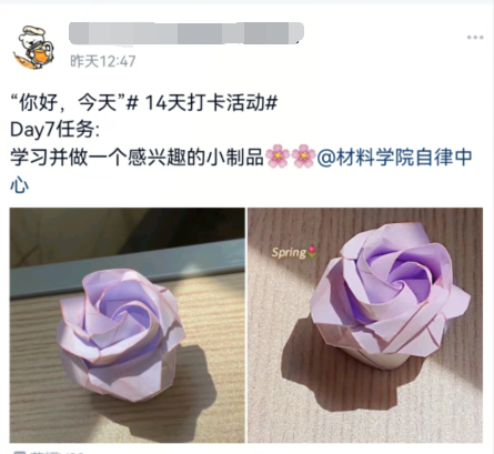 日前,材料學(xué)院開展“你好,今天”14天自律打卡活動(dòng),電影讀后感、折紙、健身打卡、宅學(xué)筆記……同學(xué)們踴躍報(bào)名參與,幫助同學(xué)們養(yǎng)成良好習(xí)慣。