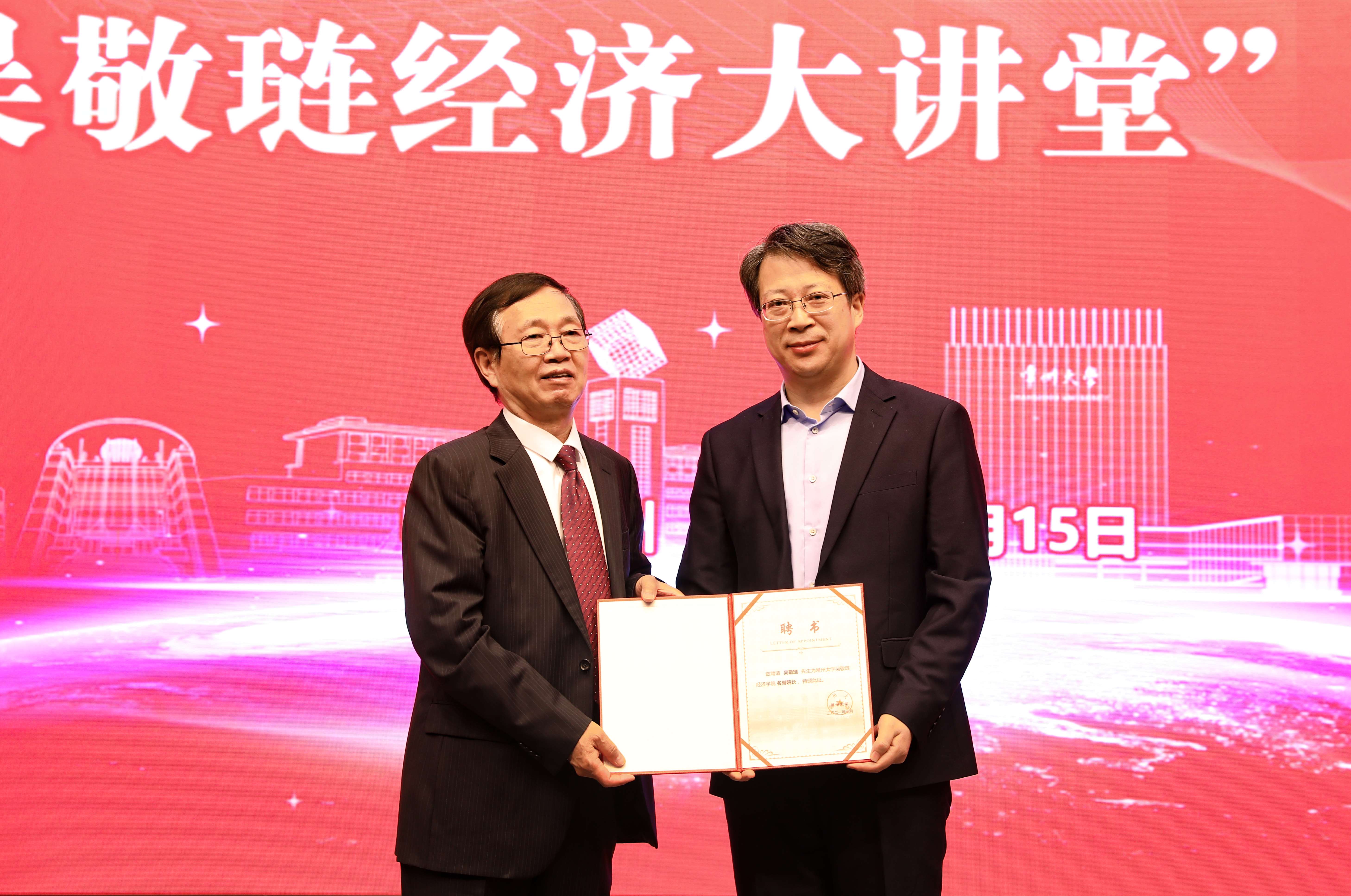 3月15日上午,常州大學吳敬璉經(jīng)濟學院揭牌暨“吳敬璉經(jīng)濟大講堂”啟動儀式在科教城校區(qū)文彰樓報告廳舉行。國家發(fā)改委宏觀經(jīng)濟研究院原副院長、中國人民大學發(fā)展與改革研究院常務副院長馬曉河,第七大道執(zhí)行董事兼CFO、無錫市上市公司協(xié)會副秘書長李正全,孫冶方基金會理事長顧問葛俊,中信出版集團《比較》雜志副主編吳素萍,常州市人大常委會委員、財政經(jīng)濟委員會副主任委員李亞雄,常州市政府研究室原主任盛祖祥,常州市現(xiàn)代企業(yè)發(fā)展研究會會長周俊,常州市現(xiàn)代企業(yè)發(fā)展研究會常務副會長、派德科技董事長盧文曉,常州匯塑勤業(yè)進出口有限公司總經(jīng)理陳祥應邀出席。我校黨委書記陳群,黨委副書記、校長徐守坤,黨委常委、副校長黃海燕,黨委常委、總會計師陸華良,黨委常委、宣傳部部長楊琳出席活動。學校相關職能部門負責人、文科學院負責人和教師、學生代表參加活動。陸華良主持活動。