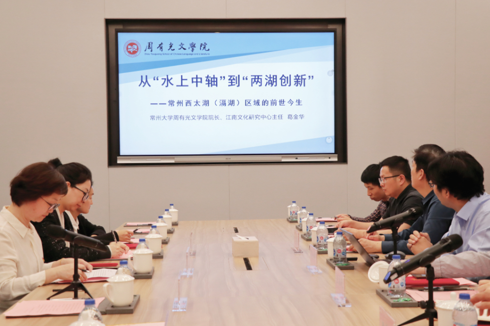 活動中,全體參會人員在現場工作人員的引導下,通過沉浸式聆聽、全景式體驗,全方位領略了“兩湖”創新區創新生態、產業生態、自然生態三生聯動,以及科技之美、智造之美、青春之美交相輝映的美好藍圖和現實模樣。在黨課講堂中,周有光文學院負責人以《從“水上中軸”到“兩湖創新”——常州西太湖(滆湖)區域的前世今生》為題,從西太湖的自然、區位與人文,文化滆湖、中軸的肇始,西太湖的文化底蘊及其美好未來等方面娓娓道來,帶領大家共同梳理和重識“兩湖”、尤其是西太湖區域的歷史文化,挖掘其文化底蘊,讓大家對這一區域的“文化熟地”特性、交通樞紐特點和人文聚落特征有了更進一步的認識。尋古識今,兩校師生共同領略了“時與勢 湖與城”,對常州“532”發展戰略和“兩湖”創新區的建設有了更為直觀的了解和感受。