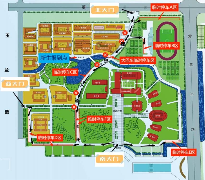 2、所有進校機動車輛按交通引導(dǎo)圖(見下方附件)行駛、停放。學(xué)生生活區(qū)(理想大道西側(cè))周邊為新生報到及校車泊載區(qū)域,周邊附近路口將進行封閉,禁止車輛停放和通行。