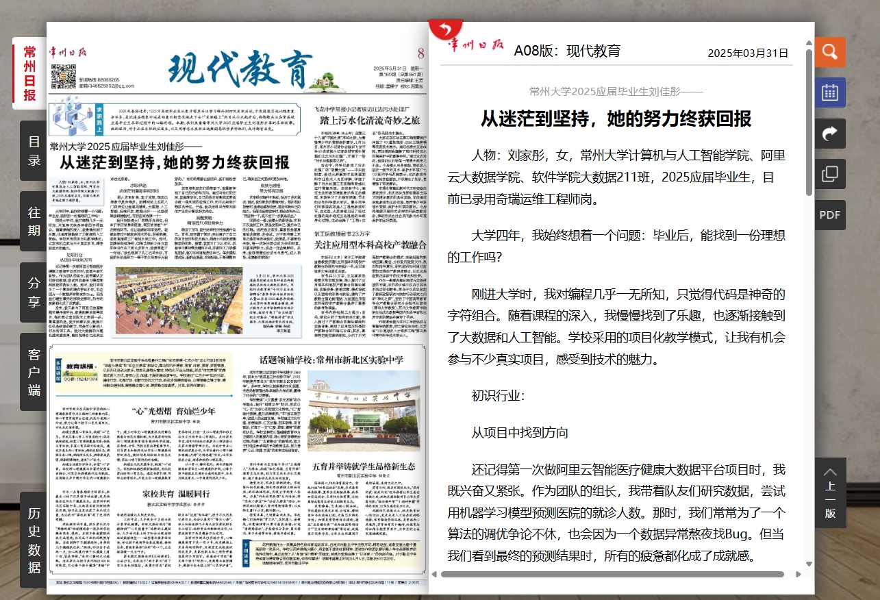 人物:劉家彤,女,常州大學計算機與人工智能學院、阿里云大數據學院、軟件學院大數據211班,2025應屆畢業生,目前已錄用奇瑞運維工程師崗。
