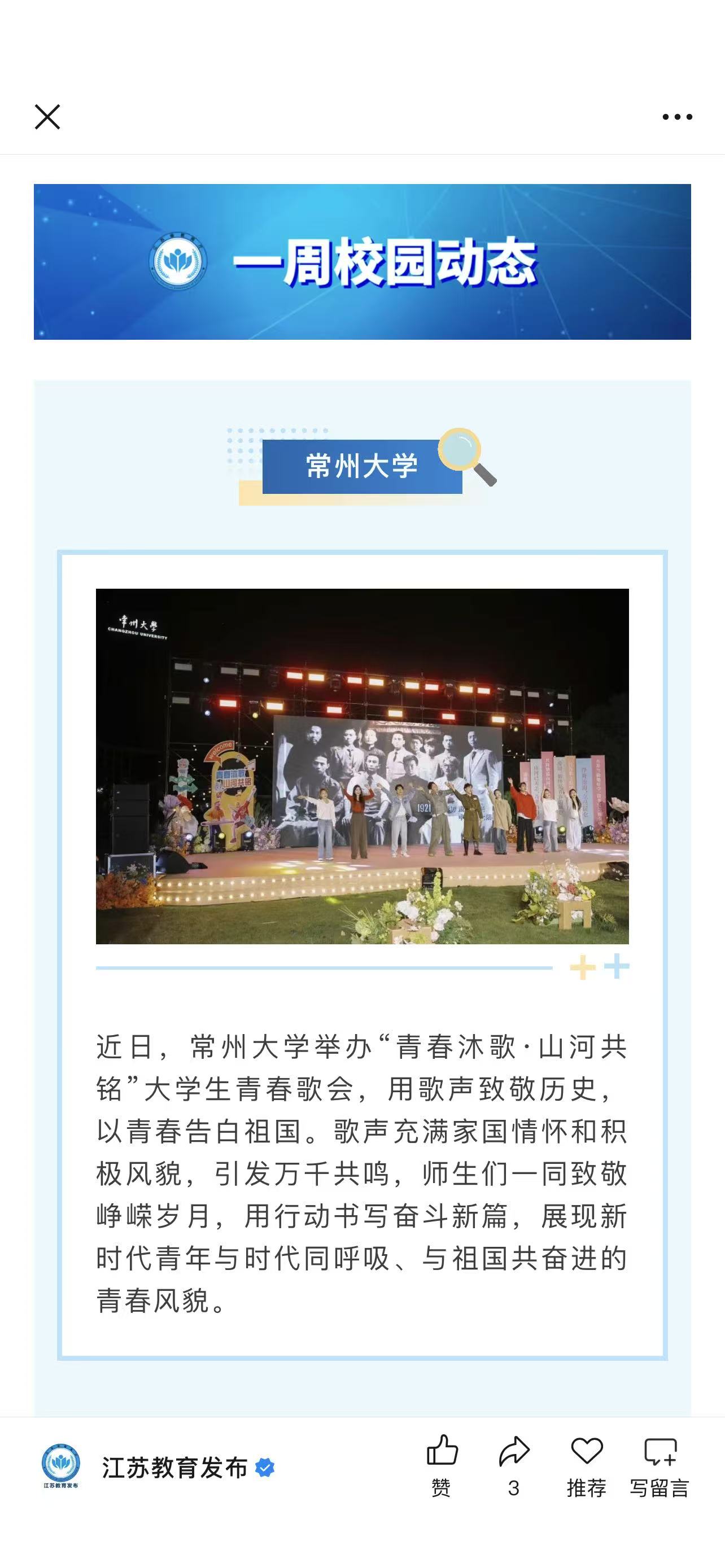 近日,常州大學舉辦“青春沐歌·山河共銘”大學生青春歌會,用歌聲致敬歷史,以青春告白祖國。歌聲充滿家國情懷和積極風貌,引發萬千共鳴,師生們一同致敬崢嶸歲月,用行動書寫奮斗新篇,展現新時代青年與時代同呼吸、與祖國共奮進的青春風貌。