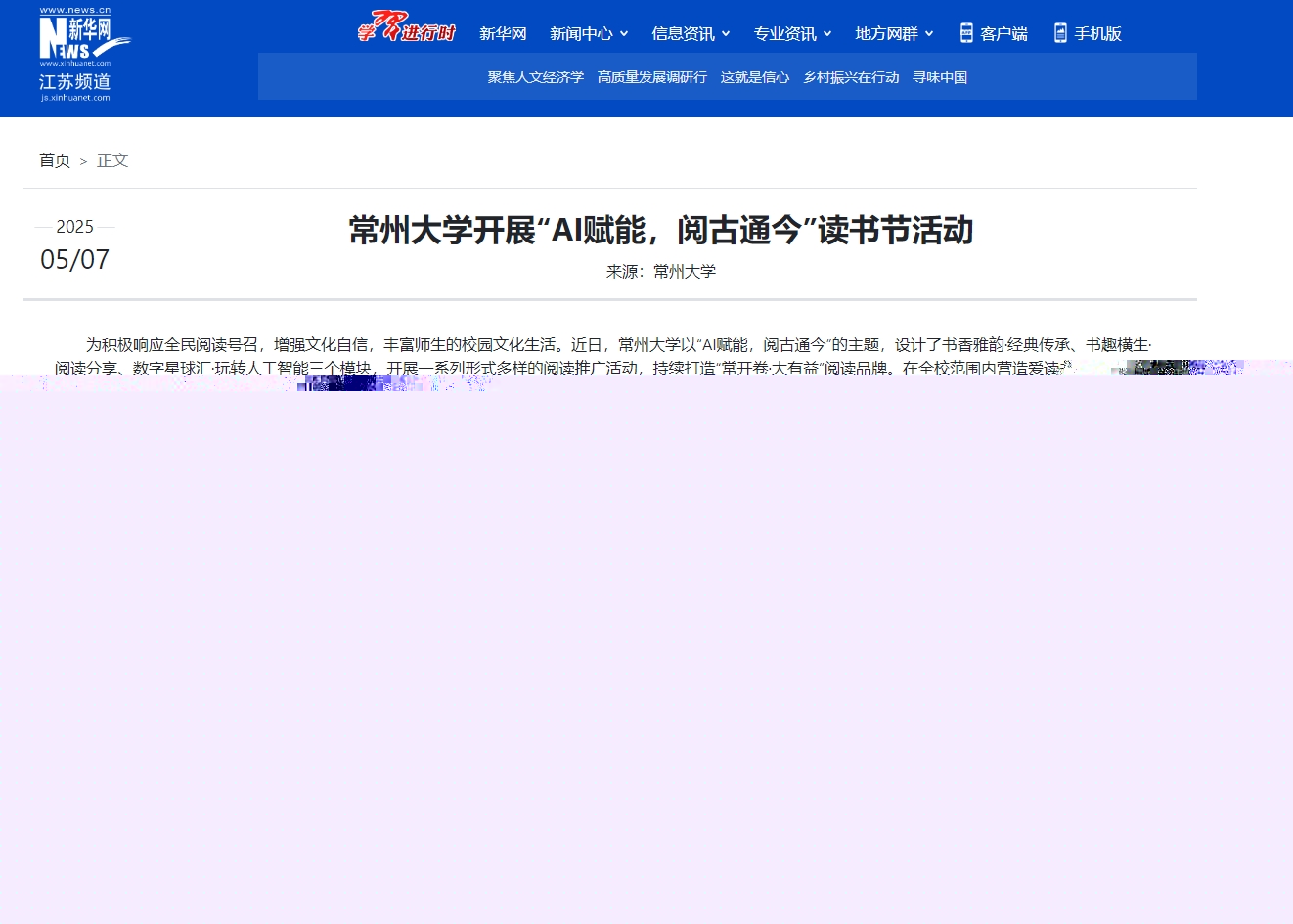為積極響應全民閱讀號召,增強文化自信,豐富師生的校園文化生活。近日,常州大學以“AI賦能,閱古通今”的主題,設計了書香雅韻·經典傳承、書趣橫生·閱讀分享、數字星球匯·玩轉人工智能三個模塊,開展一系列形式多樣的閱讀推廣活動,持續打造“常開卷·大有益”閱讀品牌。在全校范圍內營造愛讀書、讀好書、善讀書的濃厚氛圍,讓滿校書香成為學校的最亮底色。