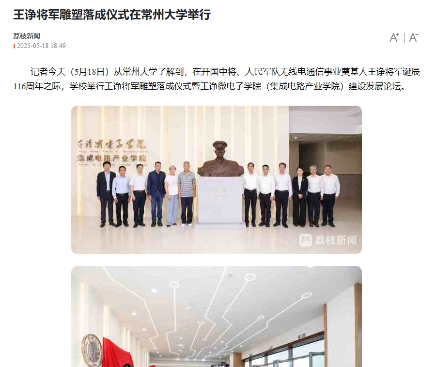 記者今天(5月18日)從常州大學了解到,在開國中將、人民軍隊無線電通信事業奠基人王諍將軍誕辰116周年之際,學校舉行王諍將軍雕塑落成儀式暨王諍微電子學院(集成電路產業學院)建設發展論壇。